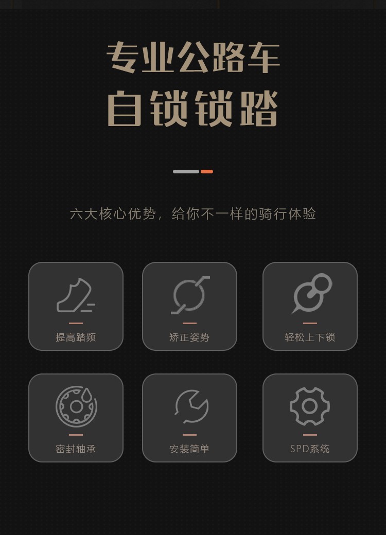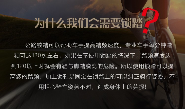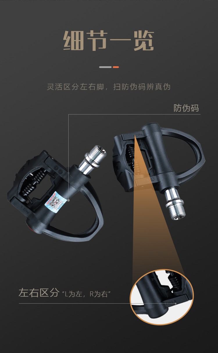 #公路車專業(yè)自鎖鎖踏,適用SPD-SL系統(tǒng),自帶鎖片體驗不一樣的騎行速度、穩(wěn)定、省力,踏板流線型一體化設(shè)計,高強(qiáng)度質(zhì)量輕的尼龍材料加持,一對鎖踏僅重約278g,鎖片重量約88g,松緊度可調(diào)節(jié)的張力設(shè)置,靈活度更高,統(tǒng)一螺紋口徑14mm。
